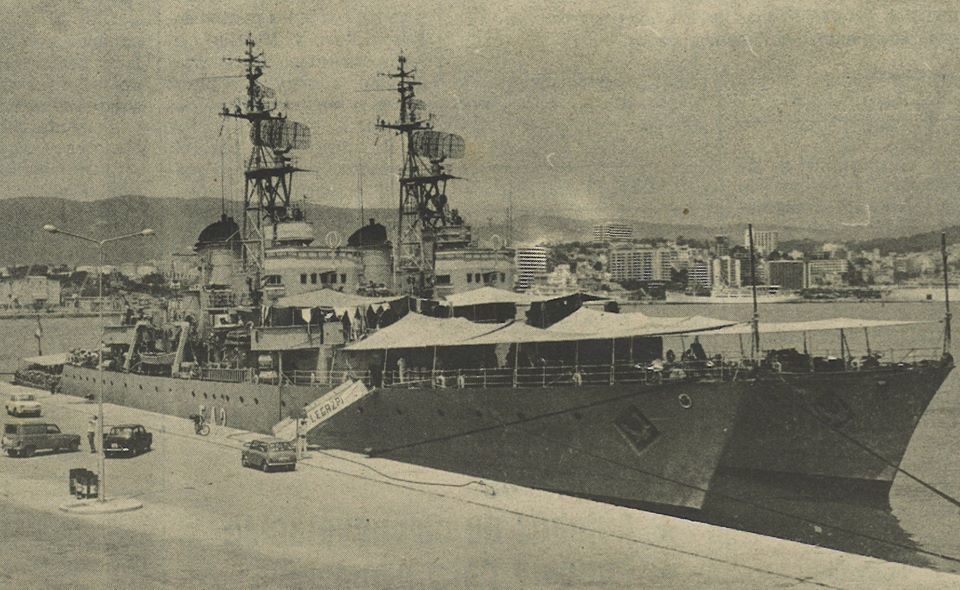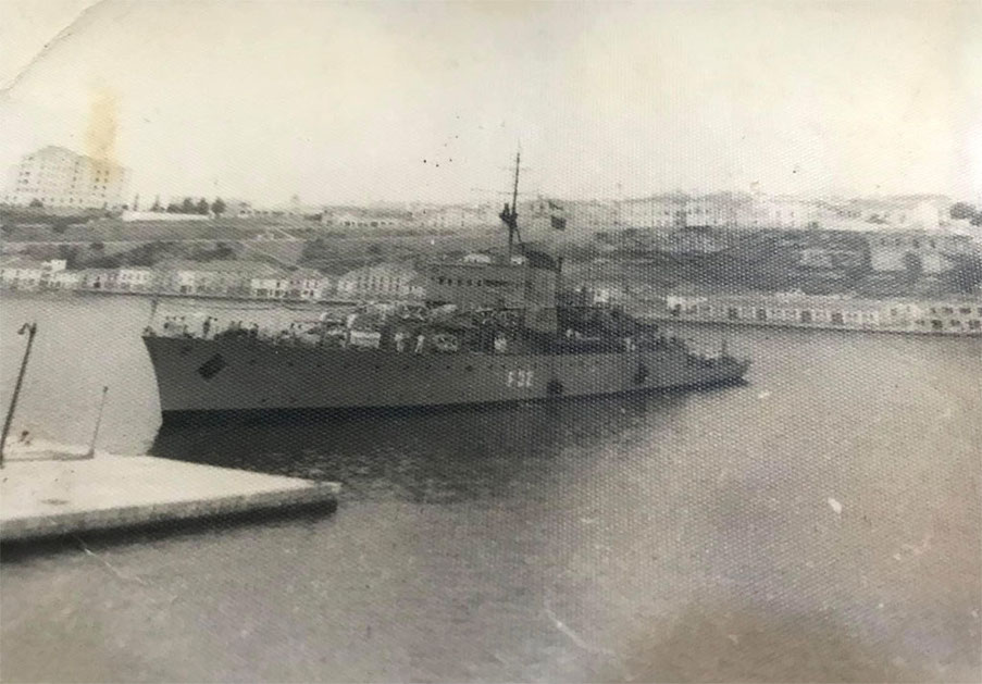 Fragata Pizarro en el puerto de Palma Octubre de 1955. Presenta armamento provisional de 3 piezas de 105 mm.