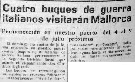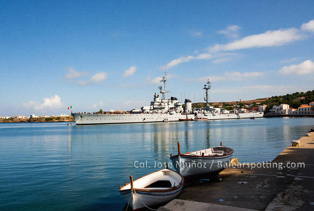 Bella estampa del crucero Luigi di Savoia Duca degli Abruzzi en el puerto de Mao en abril de 1957. Foto coloreada.