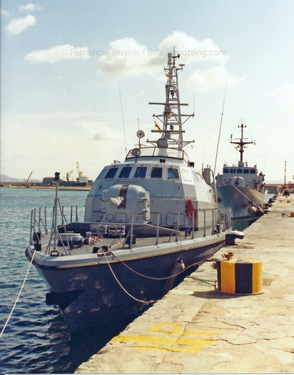 La G.102 Miccoli en la primera alineación del Dique del Oeste de Palma, a popa se encontraba la P03 Denaro.
